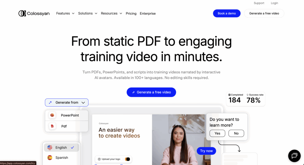 • Colossyan: Offers interactive training scenarios, letting employees make choices during the video. This improves engagement and knowledge retention.